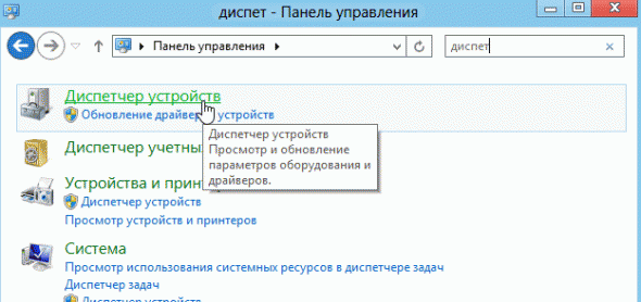 - Перевірте, чи встановлені драйвера на звукову карту на вашому ПК. Якщо звук в колонках у вас є - значить з драйверами все в порядку. Якщо немає - зайдіть для початку в диспетчер пристроїв (для цього відкрийте панель управління, і вбийте в пошуковий рядок «диспетчер», див. Скріншот нижче).