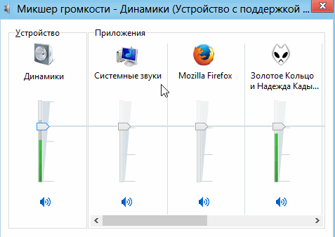 - Також по бігають повзункам звуку (показані зеленим кольором на скріншоті нижче) можна зробити висновок про те, програється чи звук взагалі на ПК. Як правило, якщо все добре - смужка буде постійно змінюватися по висоті.