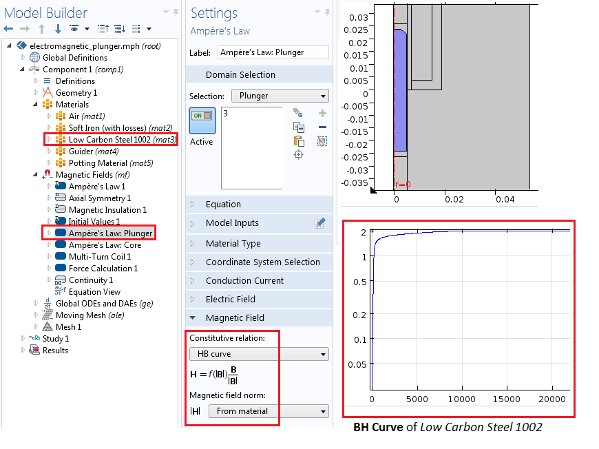 Для розрахунку електромагнітних полів в нашому устрої використовуватимемо фізичний інтерфейс Magnetic Fields. Щоб вказати те, що поршень зроблений з нелінійного магнітного матеріалу, виберемо матеріальну модель HB curve (HB-крива намагнічування) в вузлі Ampère's Law (Закон Ампера), який потрібно додатково додати в інтерфейс. Для сердечника, виконаного з м'якого заліза (Soft Iron) проведемо аналогічну операцію. Зверніть увагу, що в такому випадку, маючи два різних вузла Ampère's Law, ми можемо використовувати для поршня і сердечника різні матеріальні моделі при необхідності.