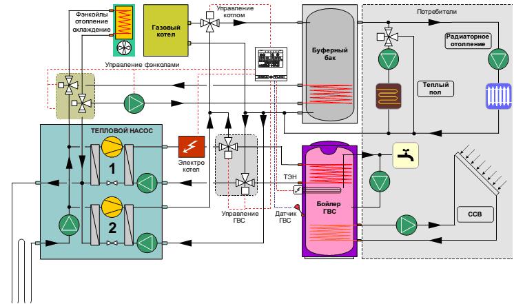 Управління ГВП - триходовий перемикаючий клапан комутації магістралі на гаряче водопостачання або на контур опалення / охолодження.