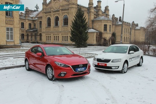 Для цього порівняльного тесту суперника нашої головної героїні Mazda 3 ми підібрали не відразу. Одвічні конкуренти в особі Toyota Corolla і Honda Civic здавалися нам не такими цікавими для цієї дуелі, і тому ми вирішили розширити кругозір, вибравши другим автомобілем Skoda Octavia! На перший погляд ці моделі не здаються прямими конкурентами, але давайте спробуємо розібратися докладніше. За своїми габаритними характеристиками автомобілі дуже близькі, хоча Octavia трохи довший, ширший і вищий. Але разом з тим, у неї менше колісна база. А ширина колії практично однакова. Але остаточно ми переконалися в правоті нашої вибору коли побачили, що частіше за інших Mazda 3 відвідувачі Infocar.ua порівнюють саме з Octavia A7! Тому на порядку денному у нас битва типових представників Країни сонця, що сходить і Старого Світу!
