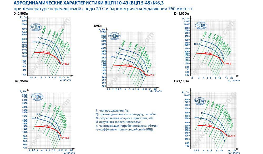 - Вентилятори ВЦП110-43 (ВЦП 5-45) можуть комплектуватися робочими колесами різних номіналів (0,9Dн; 0,95Dн; 1Dн; 1,05Dн; 1,1Dн).