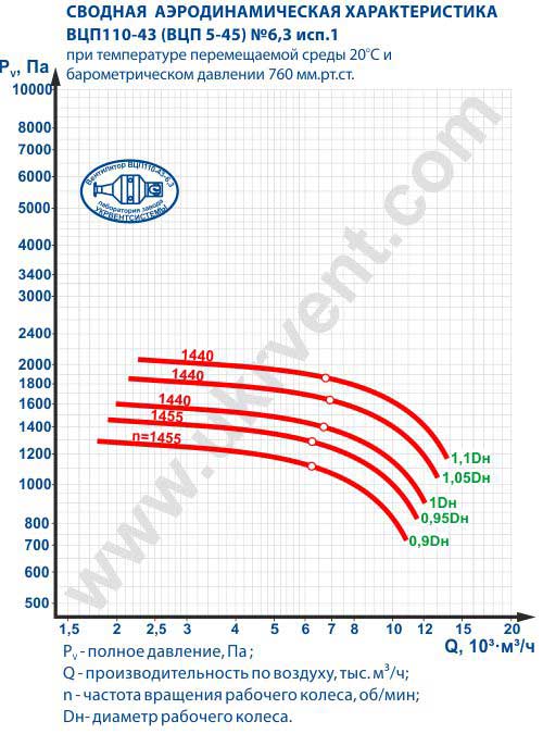 Технічні характеристики Вентилятори пилові ВЦП110-43 (ВЦП5-45) №6,3 при температурі переміщуваного СЕРЕДОВИЩА 20оС І барометричний тиск 760 мм.рт.ст.