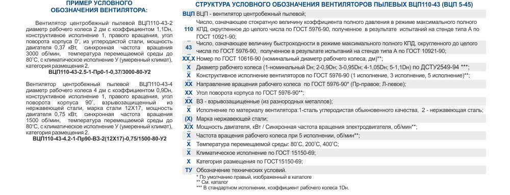 Пилові вентилятори ВЦП 110-43-6,3 (ВЦП5-45-6,3), в технічній літературі зустрічається маркування ВЦП 110-43-6,3 (ВЦП5-45-6,3) призначені для переміщення повітря і інших газоповітряних сумішей , агресивність яких по відношенню до вуглецевої сталі звичайної якості не вище агресивності повітря з температурою до 80 ° с, не містять пилу і твердих домішок у кількості більше 100 г / м3.